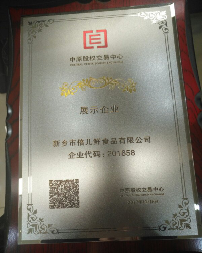 新鄉市倍兒鮮食品有限公司獲邀參加并被授予“中原交易中心展示企業”。